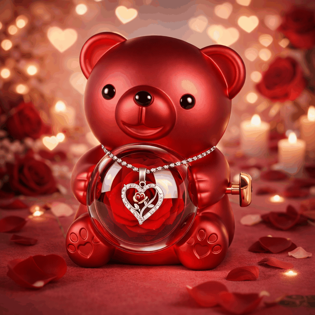 Cet ourson musical renferme une véritable rose éternelle accompagnée d’un collier bijou en forme de cœur, symbole d’un amour qui ne fane jamais.
